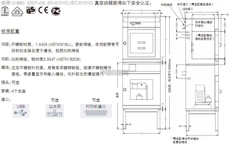 ● 模塊:選項包含了惰性氣體模塊和泵控制模塊還有額外的 加熱擱板接口(VO200:1個 / VO400,VO500:2個), 一塊加熱擱板(VO400,VO500),滴水盤